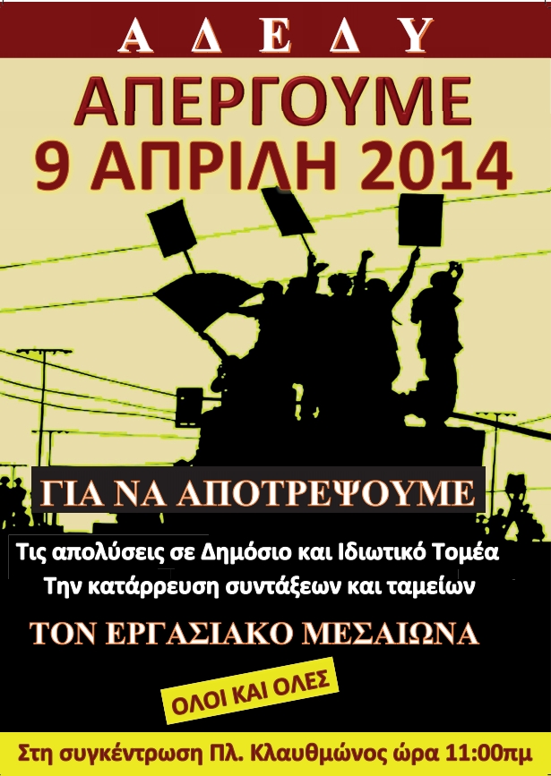 — Makis Sinodinos (@MakisSinodinos) April 9, 2014Όπως αναφέρει και η ανακοίνωση της Γενικής Συνομοσπονδίας Εργαζομένων Ελλάδος «η Κυβέρνησης σε ρόλο καταστροφέα συνεχίζει την αντεργατική πολιτική της ψηφίζοντας πολυνομοσχέδια που δίνουν τη χαριστική βολή σε κοινωνία και οικονομία καταργώντας κάθε παροχή κοινωνικής ασφάλειας, εντείνοντας την ύφεση και τα αδιέξοδα.» Διαβάστε εδώ όλη την ανακοίνωση