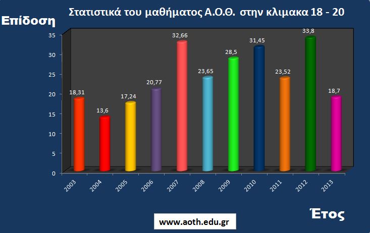 Αξίζει να αναφερθεί ότι η επίδοση αυτή είναι η τέταρτη χειρότερη μεταξύ των ετών 2003 - 2013. Επιχειρώντας να αναλύσουμε τα αίτια αυτής της καθίζησης στο μάθημα Α.Ο.Θ. θα μπορούσαμε να εστιάσουμε στα εξής στοιχεία.
