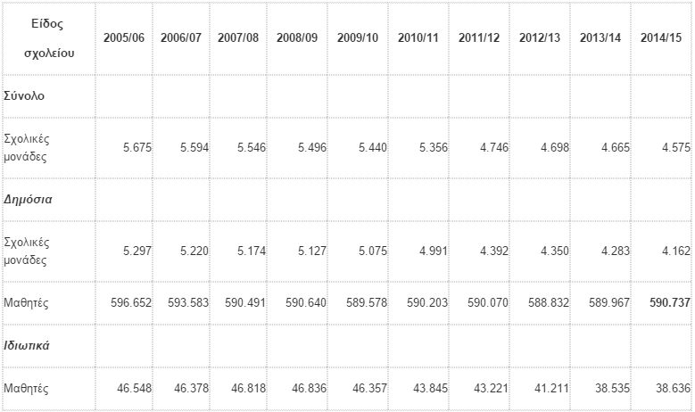 Σύμφωνα με τα τελευταία στοιχεία της ΕΛΣΤΑΤ στη δεκαετία 2005/06 - 2014/15 έχουμε πάνω από 1100 σχολικές μονάδες Πρωτοβάθμιας εκπαίδευσης λιγότερες ενώ ο μαθητικός πληθυσμός παραμένει σχεδόν ίδιος (από 596 χιλιάδες το 2004/05 σε 590 χιλιάδες το 2014/15