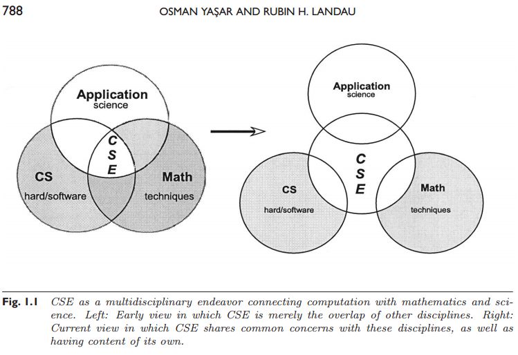 Σύμφωνα με τους Yasar & Landau (2003), αρχικά, όπως φαίνεται στο αριστερό τμήμα της παρακάτω εικόνας, η Υπολογιστική Επιστήμη θεωρούνταν η τομή της επιστήμης της Φυσικής και άλλων γνωστικών πεδίων (Application science), της επιστήμης των υπολογιστών και των εφαρμοσμένων μαθηματικών. Αργότερα, όπως φαίνεται στο δεξιό τμήμα της παρακάτω εικόνας, προστέθηκε ένα ακόμα κύκλος λόγω τους γεγονότος ότι ή ίδια η Υπολογιστική Επιστήμη ανέπτυξε δικά της εργαλεία με τα οποία μπορεί να γεφυρώσει τις τρεις άλλες επιστήμες.