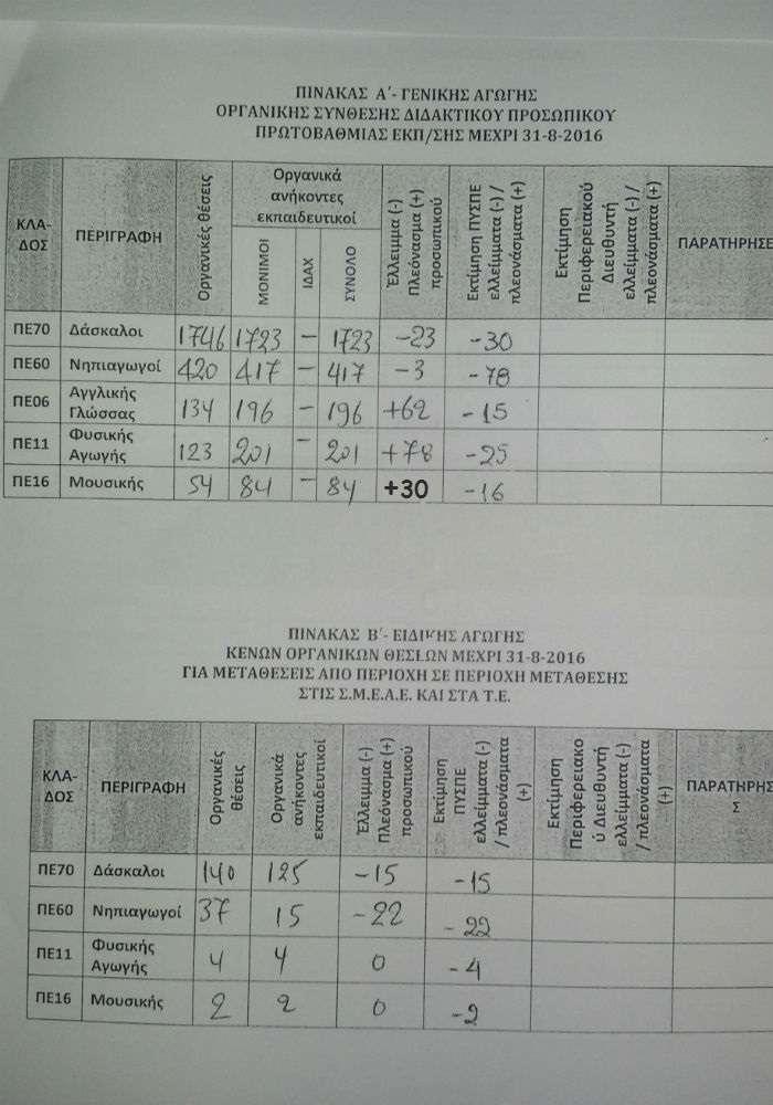 Στην 4η στήλη η εκτίμηση του ΠΥΣΠΕ για τα ελλείμματα(-) ή τα πλεονάσματα(+) των εκπαιδευτικών σε σχέση με τους οργανικά ανήκοντες.