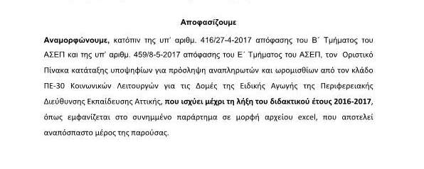 Αναμόρφωση οριστικού πίνακα κατάταξης υποψηφίων αναπληρωτών και ωρομισθίων από τον κλάδο ΠΕ30- Κοινωνικών Λειτουργών Σχολικού Έτους 2016-2017 για τις Δομές της Ειδικής Αγωγής της Περιφερειακής Διεύθυνσης Εκπαίδευσης Αττικής