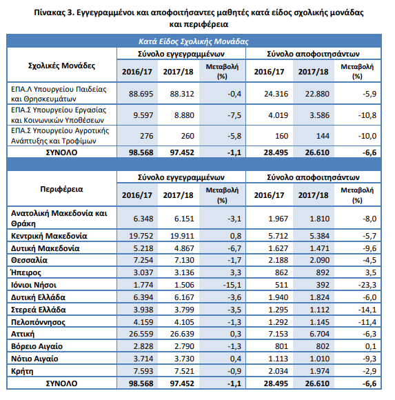 ▪ Οι αποφοιτήσαντες μαθητές κατά το σχολικό έτος 2017/2018 σε σχέση με το 2016/2017, παρουσίασαν μείωση από 28.495 σε 26.610 (πίνακας 3).