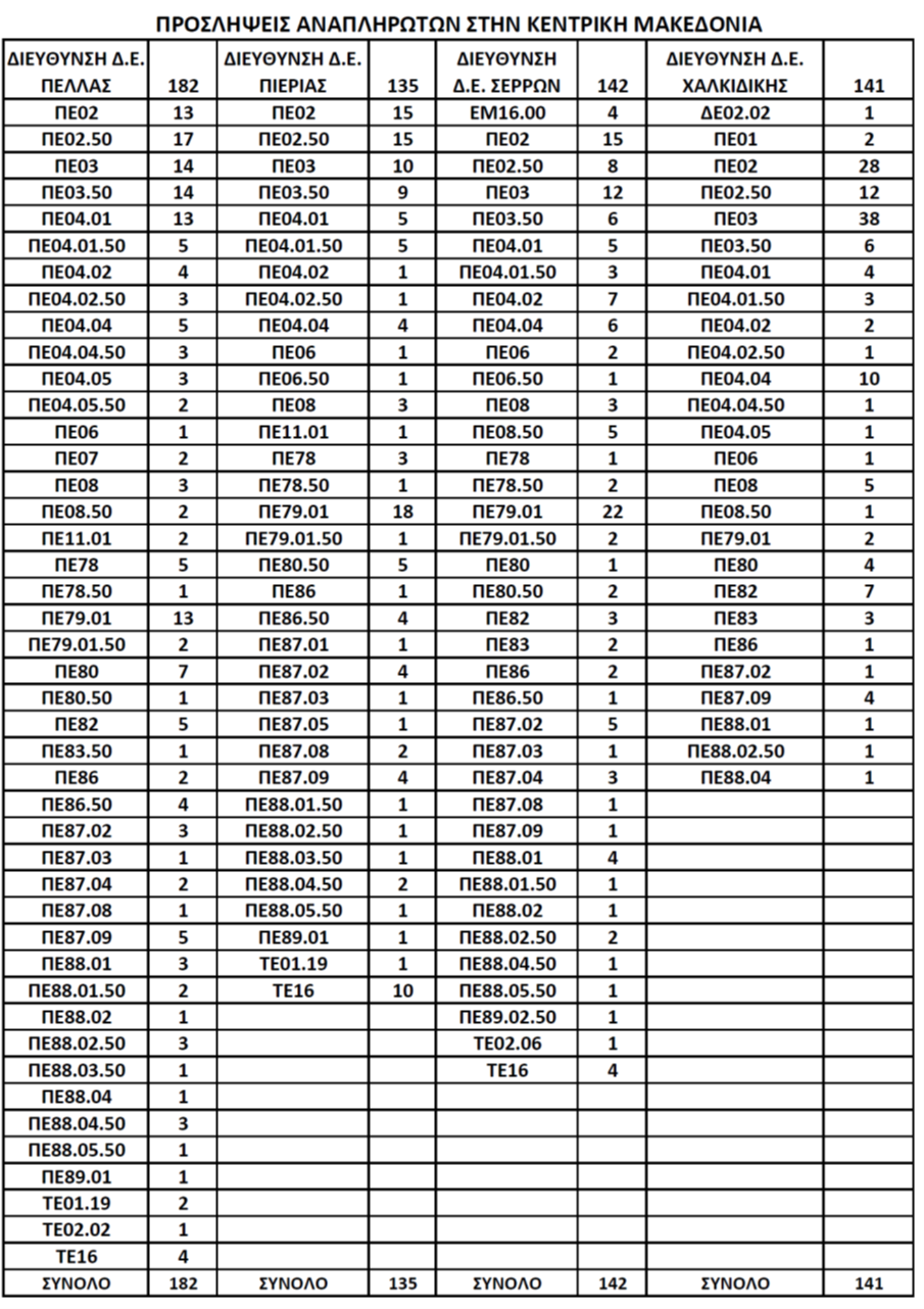 Στους παρακάτω 4 πίνακες υπάρχουν αναλυτικά τα κενά και οι προσλήψεις αναπληρωτών κατά ΔΔΕ και ειδικότητα