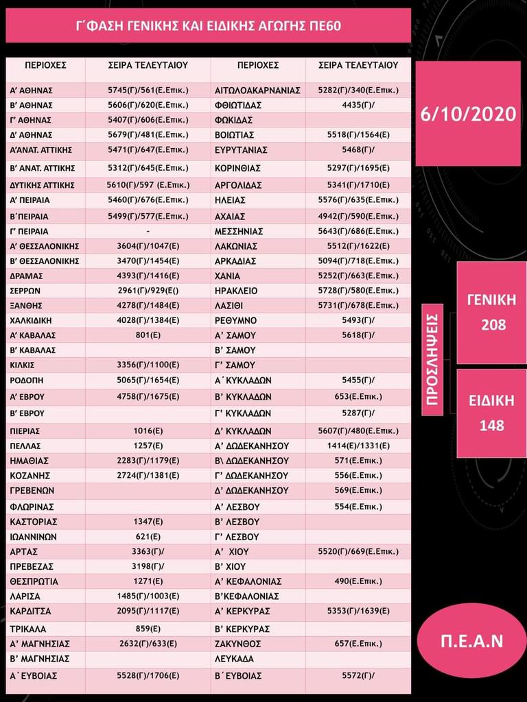 Συγκεντρωτικός πίνακας Γενικής και Ειδικής ΠΕ60 μετά την Γ φάση