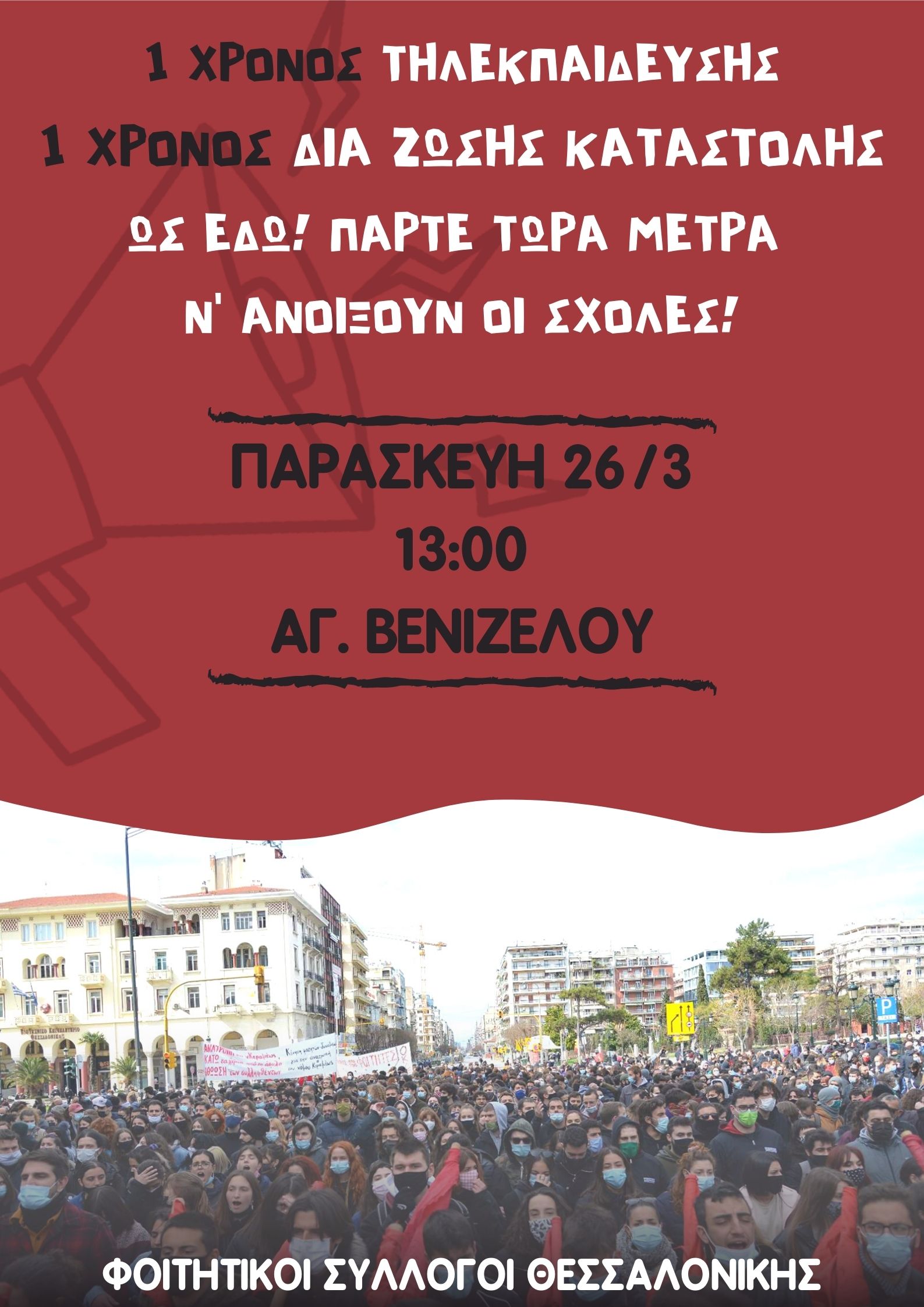 -Παρασκευή 26/3 το απόγευμα εκδήλωση των ΦΣ μαζί με τους καθηγητές στην Πρυτανεία του ΑΠΘ με τίτλο «1 χρόνος τηλεκπαίδευσης – 1 χρόνος διά ζώσης καταστολής»