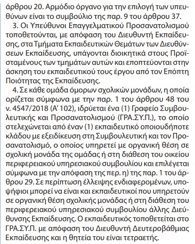 4. Σε κάθε ομάδα όμορων σχολικών μονάδων, η οποία ορίζεται σύμφωνα με την παρ. 1 του άρθρου 48 του ν. 4547/2018 (Α’ 102), ιδρύεται ένα (1) Γραφείο Συμβουλευτικής και Προσανατολισμού (ΓΡΑ.ΣΥ.Π.), το οποίο στελεχώνεται από έναν (1) εκπαιδευτικό οποιουδήποτε κλάδου με εξειδίκευση στη Συμβουλευτική και τον Προσανατολισμό, ο οποίος υπηρετεί με οργανική θέση σε σχολική μονάδα της ομάδας ή στη διάθεση του οικείου περιφερειακού υπηρεσιακού συμβουλίου και επιλέγεται σύμφωνα με την απόφαση της περ. η) της παρ. 1 του άρθρου 29.