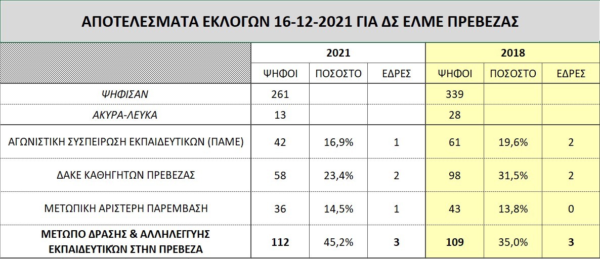 Μεγάλη μείωση ποσοστού και αριθμού ψήφων κατέγραψε η ΔΑΚΕ Καθηγητών Πρέβεζας, η οποία ωστόσο διατήρησε δύο έδρες, ενώ το ψηφοδέλτιο που στήριξε το ΠΑΜΕ έχασε μία έδρα, η οποία πήγε στην Μετωπική Αριστερή Παρέμβαση, που θα εκπροσωπηθεί στο νέο Δ.Σ.