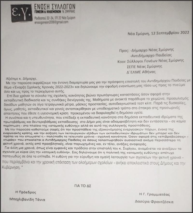 Έντονες αντιδράσεις έχει ήδη προκαλέσει η επιστολή που έστειλε η δημοτική αρχή του Δήμου Νέας Σμύρνης προς τους διευθυντές των σχολείων και τους συλλόγους Γονέων του δήμου, με την οποία τούς ζητά να... «περιορίσουν» τη θέρμανση και τον φωτισμό μέσα στις σχολικές αίθουσες.