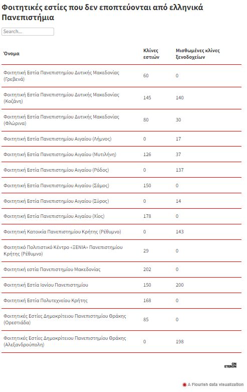Συνολικά, λοιπόν, οι εστίες εποπτείας των πανεπιστημίων διαθέτουν 1.288 κλίνες. Παράλληλα, κάποια πανεπιστήμια μισθώνουν κλίνες σε συνεργαζόμενα ξενοδοχεία, οι οποίες ανέρχονται σε 916.