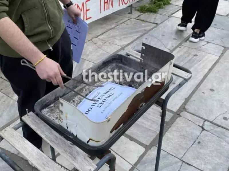 Συγκέντρωσης διαμαρτυρίας στην πλατεία της Καμάρας, στη Θεσσαλονίκη, πραγματοποιήθηκε το πρωί κατά της ίδρυσης ιδιωτικών πανεπιστημίων, όπου φοιτητές έβαλαν φωτιά σε αντίτυπα των πτυχίων.