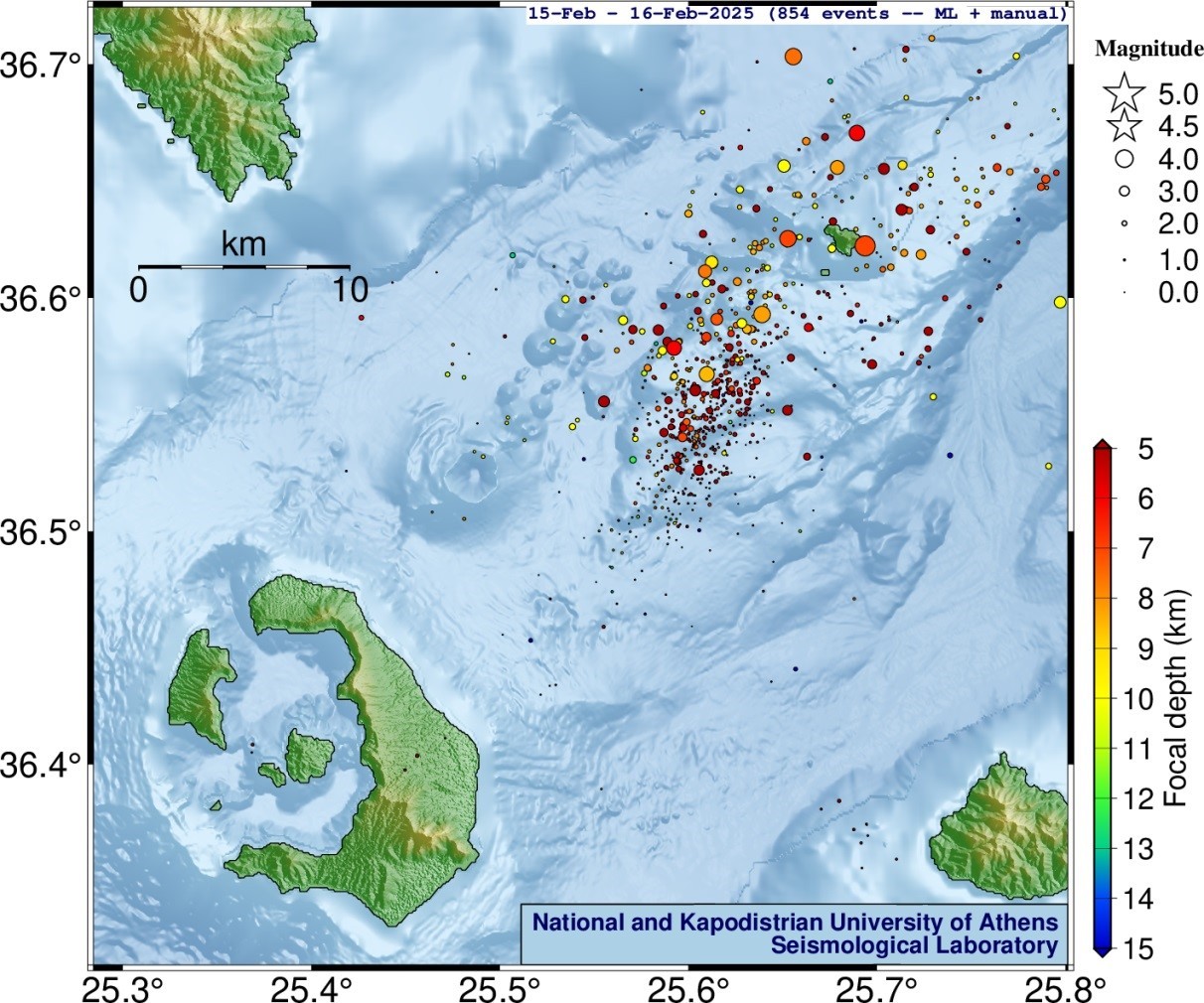 Από την έναρξη της σεισμικής δραστηριότητας στη ζώνη Σαντορίνης-Αμοργού στις 26 Ιανουαρίου έως και τις 15 Φεβρουαρίου 2025, το Εργαστήριο Σεισμολογίας (ΕΣ) του ΕΚΠΑ (http://dggsl.geol.uoa.gr/ ) έχει ανιχνεύσει και εντοπίσει συνολικά, με αυστηρά κριτήρια για τη διασφάλιση της ποιότητας των αποτελεσμάτων, ~20,000 σεισμούς με μεθόδους μηχανικής μάθησης (τεχνητής νοημοσύνης), εκ των οποίων άνω των 17,400 με μεγέθη Μ³1.0. Στις 15 Φεβρουαρίου καταγράφηκαν πάνω από 750 σεισμοί, με 36 να έχουν μέγεθος Μ³2.5, και κανέναν (0) σεισμό Μ³4.0, με τους δύο μεγαλύτερους σεισμούς να έχουν μέγεθος 3.9. Σύμφωνα με τα στοιχεία καθημερινής ανάλυσης σεισμικών δεδομένων (χωρίς χρήση μεθόδων μηχανικής μάθησης) του Εργαστηρίου Σεισμολογίας του ΕΚΠΑ, κατά την 16η Φεβρουαρίου έχουν καταγραφεί 89 σεισμοί, εκ των οποίων ένας (1) με μέγεθος M≥4.0, και κανένας (0) με μέγεθος Μ³4.5. O ισχυρότερος σεισμός σημειώθηκε στις 17 Φεβρουαρίου 09:49:51 (τοπική ώρα) και είχε μέγεθος 5.1. Η σεισμική δραστηριότητα περιορίζεται κυρίως στα νοτιοδυτικά της Ανύδρου.