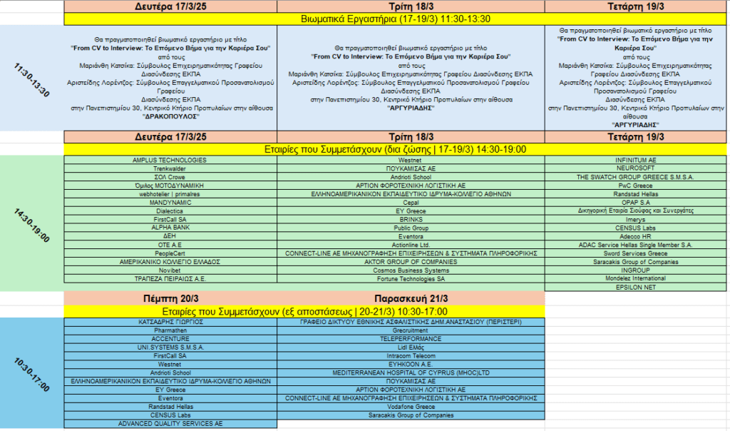 Το Γραφείο Διασύνδεσης του Εθνικού και Καποδιστριακού Πανεπιστημίου Αθηνών συμβάλλοντας στην διευκόλυνση της πρόσβασης των φοιτητών/τριων και αποφοίτων όλων των Προγραμμάτων Σπουδών του Ιδρύματος στην αγορά εργασίας, αλλά και στην υποστήριξη της διαδικασίας μετάβασης τους από τις σπουδές στον επαγγελματικό στίβο, οργανώνει για τέταρτη συνεχόμενη χρονιά τις «Ημέρες Καριέρας 2025» στο πενθήμερο από τις 17 έως 21 Μαρτίου 2025.