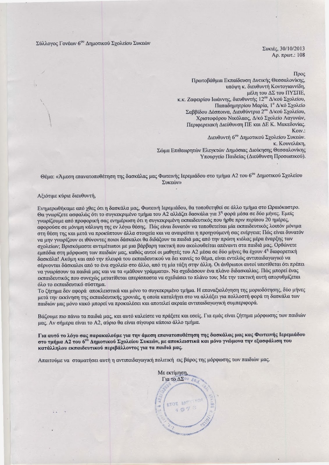 Στις 30 Οκτωβρίου πραγματοποιήθηκε διαμαρτυρία στη Διεύθυνση Πρωτοβάθμιας Εκπαίδευσης από γονείς και το Δ.Σ του συλλόγου γονέων και Κηδεμόνων του 6ου δημοτικού σχολείου Συκεών. Οι γονείς διαμαρτυρήθηκαν για την αλλαγή για ακόμη μια φορά - 3η συνολικά (είναι η 3η φορά που σημαίνει ότι οι μαθητές της Α' τάξης Α2 θα γνωρίσουν μέσα σε 1,5 μήνα την 4η δασκάλα τους) και ζήτησαν να συνομιλήσουν με τον Διευθυντή Πρωτοβάθμιας Εκπαίδευσης κ Κοντογιαννίδη.