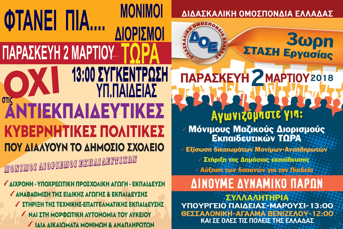 ΜΟΝΙΜΟΙ ΔΙΟΡΙΣΜΟΙ – Κινητοποίηση στο Υπ. Παιδείας Παρασκευή 2/3/18 – ΔΟΕ: 3ωρη Στάση Εργασίας – ΠΕΡΙΚΛΗΣ: 3ωρη Συμπληρωματική Στάση Εργασίας.