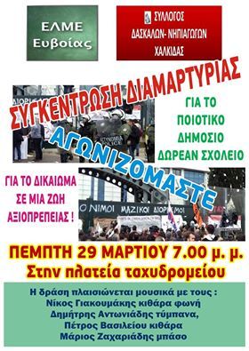 - την Πέμπτη 29 Μαρτίου στις 7.00 στην πλατεία ταχυδρομείου σε μουσική διαμαρτυρία που συνδιοργανώνουμε με την ΕΛΜΕ Εύβοιας.(Νίκος Γιακουμάκης κιθάρα φωνή, Δημήτρης Αντωνιάδης τύμπανα, Πέτρος Βασιλείου κιθάρα, Μάριος Ζαχαριάδης μπάσο)