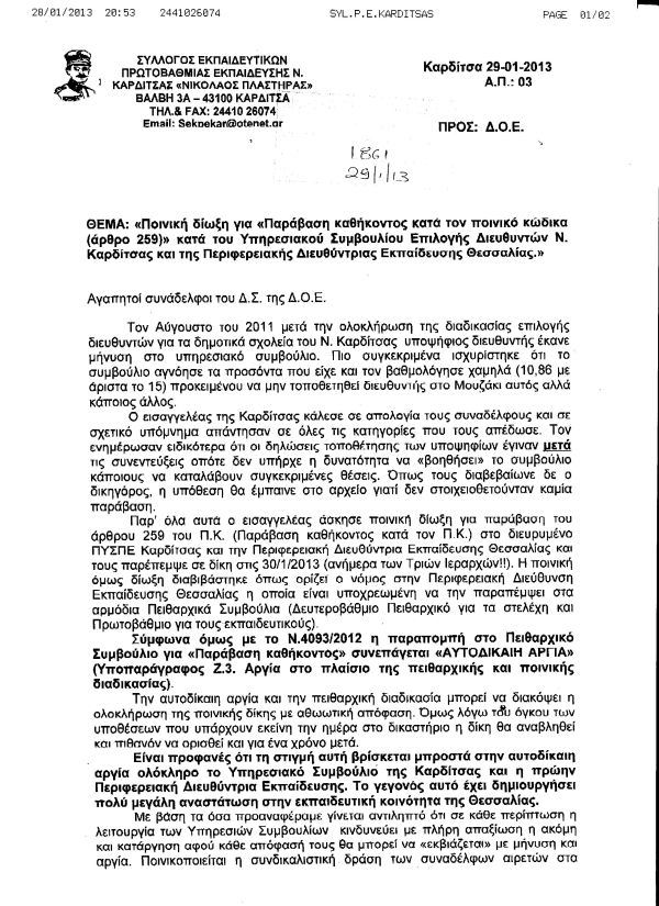 Δείγμα της εντελώς παράλογης και απαράδεκτης ρύθμισης, είναι η περίπτωση του Συμβουλίου Επιλογής Διευθυντών στην Καρδίτσα, όπου και τα 7 μέλη του (Δ/ντής Εκπαίδευσης, διορισμένα και αιρετά μέλη, Σχολικοί Σύμβουλοι) καθώς και η Περιφερειακή Διευθύντρια Εκπαίδευσης Θεσσαλίας που επικύρωσε την απόφαση, παραπέμπονται σε δίκη. Ταυτόχρονα η Περιφερειακή Διεύθυνση Εκπαίδευσης Θεσσαλίας τους παραπέμπει και στα αρμόδια Πειθαρχικά Συμβούλια (με αποτέλεσμα την αυτοδίκαιη αργία) με την κατηγορία της παράβασης καθήκοντος. Όλα αυτά προέκυψαν μετά από υποβολή μήνυσης για τη διαδικασία επιλογής Διευθυντών σχολείων που έγινε το 2011, από υποψήφιο που θεώρησε πως αδικήθηκε στην προφορική συνέντευξη (Σας επισυνάπτουμε ανακοίνωση του Συλλόγου Π.Ε. Καρδίτσας).