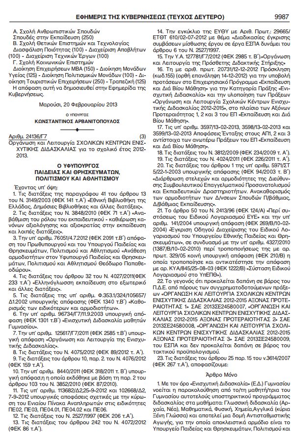ΦΕΚ: Οργάνωση και λειτουργία σχολικών κέντρων ενισχυτικής διδασκαλίας για το σχολικό έτος 2012-2013