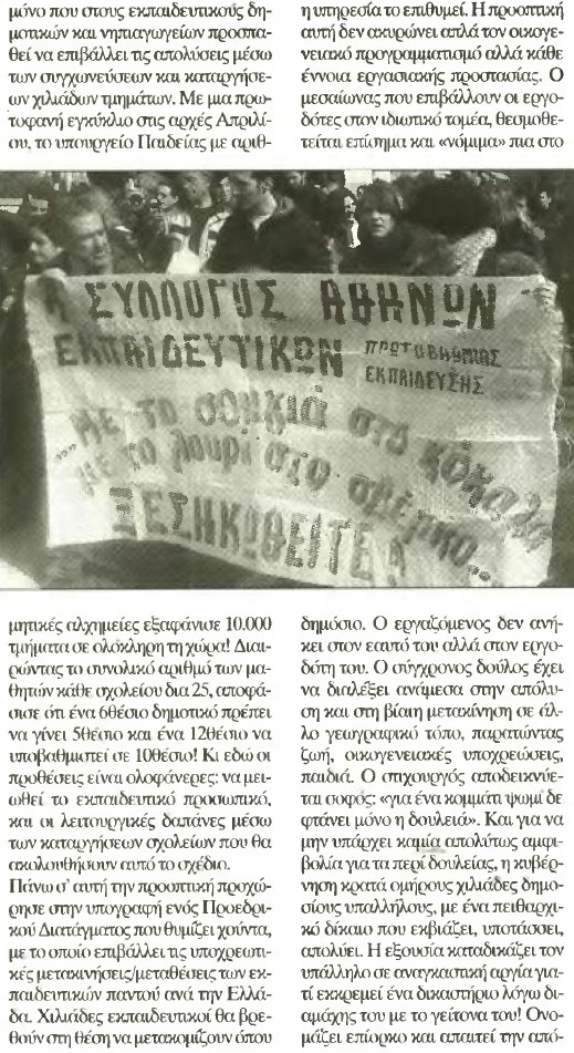 Το σχέδιο είναι μελετημένο και ξετυλίγεται γοργά. Με την απόφασή της η κυβέρνηση να αυξήσει το ωράριο των καθηγητών κατά δύο ώρες την εβδομάδα, στην ουσιά υπέγραψε την απόλυση 13.000 εκπαιδευτικών δευτεροβάθμιας (αναπληρωτών και μονίμων) μια και τους κατέστησε με τον τρόπο αυτό χωρίς αντικείμενο εργασίας. Ειδικά, ορισμένες ειδικότητες θα βρεθούν κυριολεκτικά να μην μπορούν να καλύψουν το ωράριό τους όχι γιατί δεν το επιθυμούν αλλά γιατί δεν θα περισσύουν ώρες. Παρόμοιο είναι και το σχέδιο για την Πρωτοβάθμια Εκπαίδευση