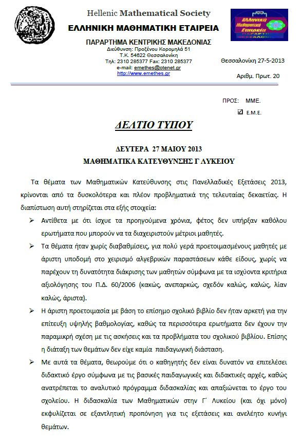 Μαθηματική Εταιρεία: Σχετικά με τα μαθηματικά κατεύθυνσης Γ λυκείου