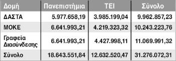 Στον πίνακα παρουσιάζεται ο προϋπολογισμός χρηματοδότησης δομών διασύνδεσης ιδρυμάτων - επιχειρήσεων έως το 2015 (τα ποσά είναι σε ευρώ) από το Επιχειρησιακό Πρόγραμμα «Εκπαίδευση και Διά Βίου Μάθηση»