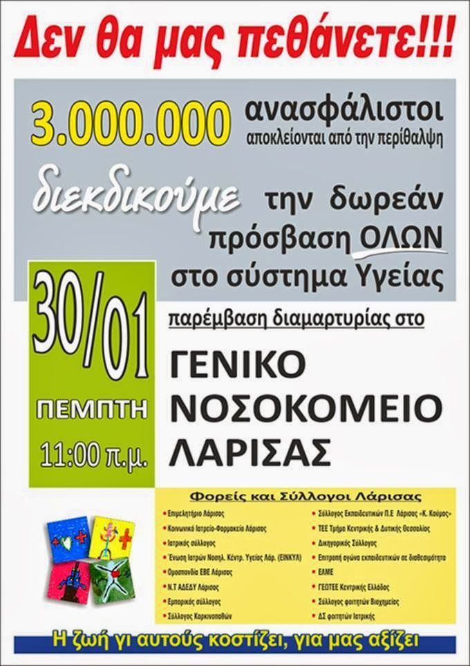 Η ΕΛΜΕ Λάρισας συνυπογράφει την ανακοίνωση των φορέων και συμμετέχει στην παρέμβαση- κινητοποίηση στις 30 Γενάρη 2014 στο Γενικό Νοσοκομείο της Λάρισας στις 11:00πμ., διεκδικώντας: