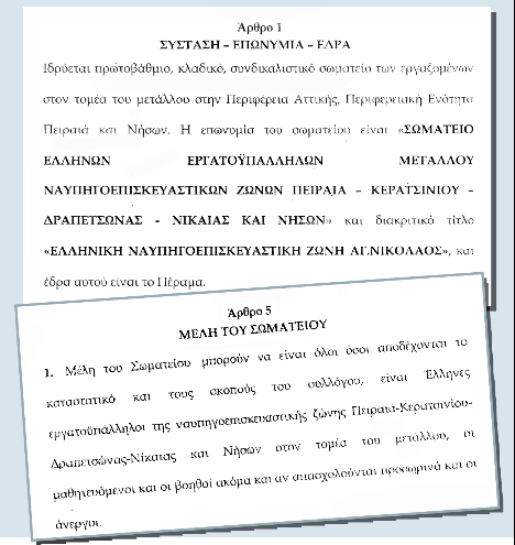 Στο «άρθρο 5» διευκρινίζεται ρητά ότι μέλη του Σωματείου μπορούν να γραφούν μόνο όσοι «είναι Ελληνες εργατοϋπάλληλοι της Ν/Ζ Ζώνης (...)». Σε άλλο σημείο, γράφεται ότι σκοπός του σωματείου είναι η «προσπάθεια απορρόφησης Ελλήνων εργατοϋπαλλήλων μετάλλου σε αντίστοιχες επιχειρήσεις». Κατά τα άλλα, οι χρυσαυγίτες και οι συνοδοιπόροι τους, προπαγανδίζουν στο καταστατικό του σωματείου τους την «κατάργηση κάθε αθέμιτης και αντικειμενικά αδικαιολόγητης διάκρισης στους όρους αμοιβής και εργασίας και εν γένει στο συμβατικό καθεστώς των εργαζόμενων στον κλάδο»!