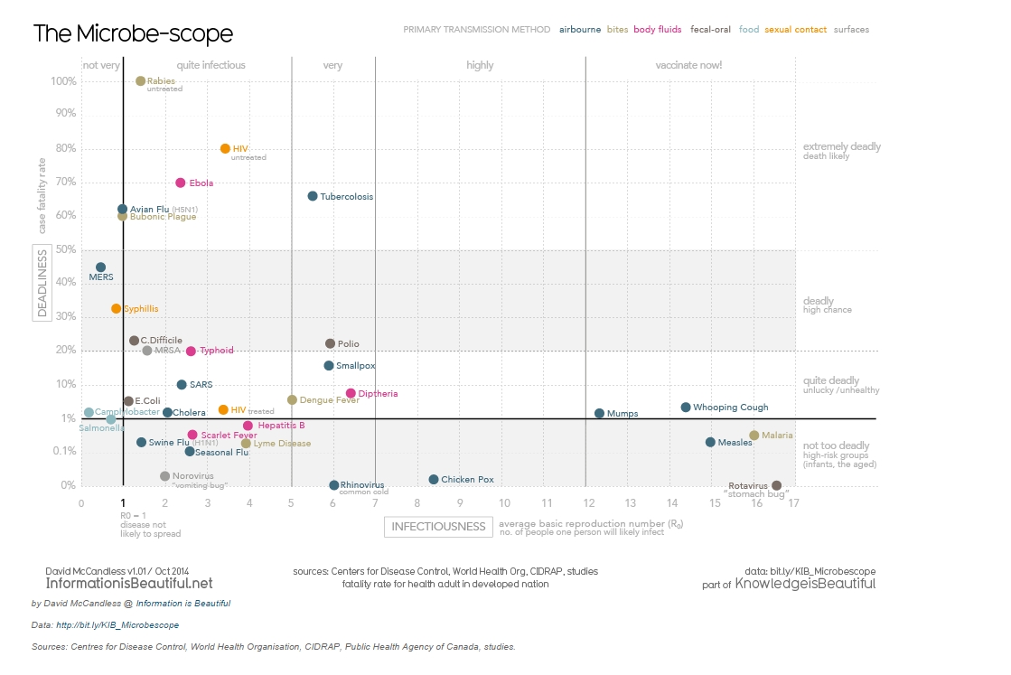 Κάθε ασθένεια έχει ένα βασικό ποσοστό αναπαραγωγής αλλά οι αριθμοί είναι διάσπαρτοι σε όλη την βιβλιογραφία. Η διαδικτυακή έκδοση της εφημερίδας τα συγκέντρωσε όλα σε ένα γράφημα, αποτυπώνοντάς τα, σύμφωνα με το βαθμό θνησιμότητας - το ποσοστό θανάτου όσων έχουν μολυνθεί. Αυτό το στοιχείο μας δίνει ενδεχομένως τη δυνατότητα να κατανοήσουμε ποιοι είναι οι πιο μολυσματικοί και θανατηφόροι ιοί και να τους συγκρίνουμε μεταξύ τους.