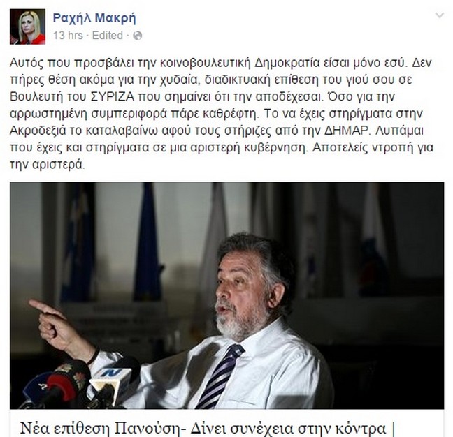 Η κ. Μακρή στον λογαριασμό της στο Facebook σχολιάζει το άρθρο του κ. Πανούση στην «Καθημερινή» σημειώνοντας χαρακτηριστικά: «Αυτός που προσβάλλει την κοινοβουλευτική Δημοκρατία είσαι μόνο εσύ».