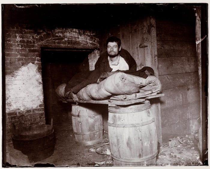 Ένας άντρας σε αυτοσχέδιο κρεβάτι με μία σανίδα πάνω σε δύο βαρέλια στη Νέα Υόρκη, γύρω στο 1890.