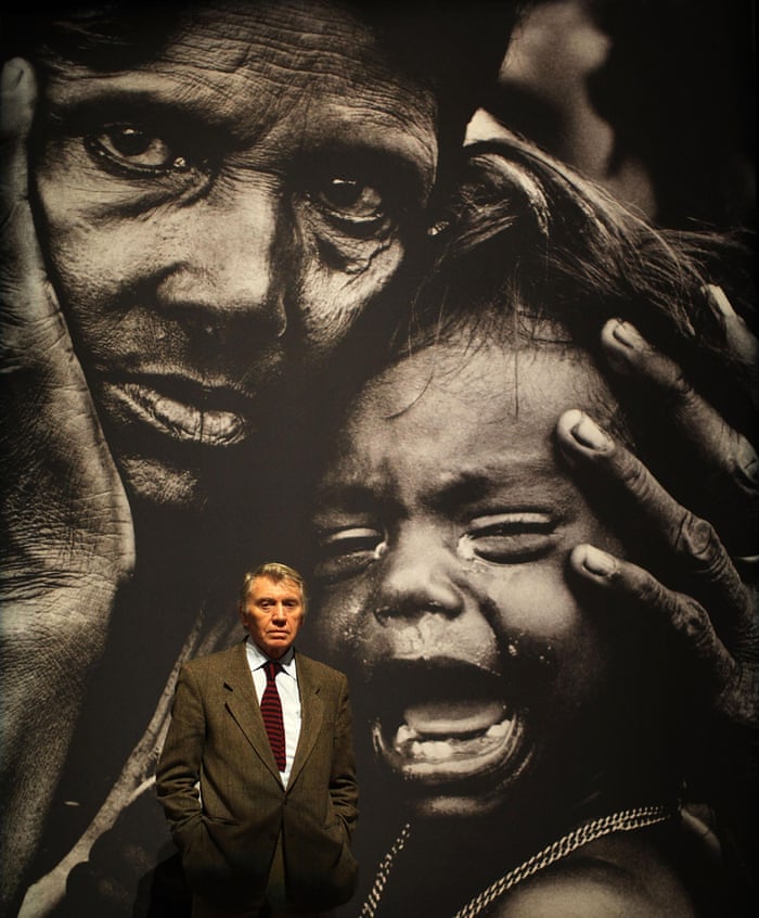 Ο Don McCullin στέκεται μπροστά από μία φωτογραφία του με μιά γυναίκα και το παιδί της που περιμένουν να τους δει γιατρός στο Μπαγκλαντές, 1971