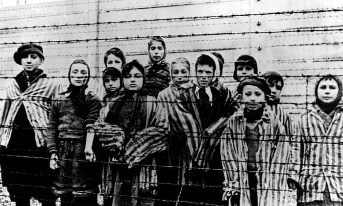 Μία ομάδα παιδιών με στολές στο στρατόπεδο συγκέντρωσης Άουσβιτς, πίσω από συρματοπλέγματα, Ιανουάριος 1945