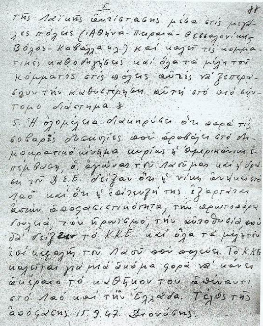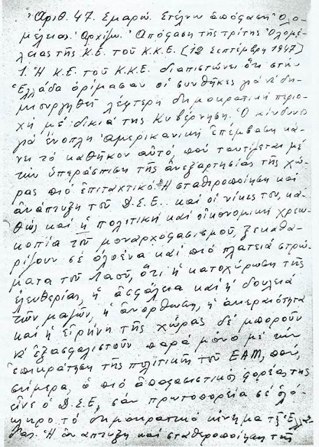 5. Η ολομέλεια διακηρύσει ότι παρά τις σοβαρές δυσκολίες που προβάλει στο δημοκρατικό κίνημα κυρίως η αμερικανική επέμβαση, ο αγώνας του λαού μας και η πάλη του ΑΣΕ δείξαν ότι η νίκη ανήκει στο λαό και ότι η επίτευξή της εξαρτάται απ' την αποφασιστικότητα, την πρωτοπόρα δουλειά, τον ηρωισμό, την αυτοθυσία που θα δείξει το ΚΚΕ και όλα τα μέλη του επικεφαλής του λαού που παλεύει. Το ΚΚΕ καλείται για μια ακόμη φορά να κάνει ακέραιο το καθήκον του απέναντι στο λαό και την Ελλάδα. Τέλος της απόφασης.15.9.47 Διονύσης.
