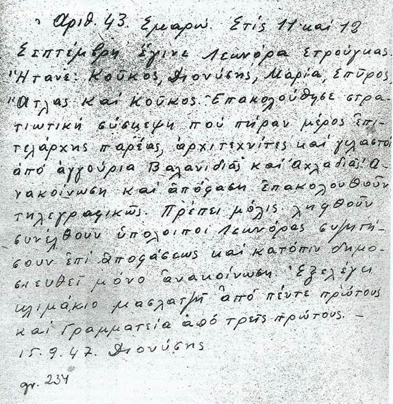 Αριθ. 43 Σμαρώ. Στις 11 και 12 Σεπτέμβρη έγινε Λεωνόρα Στρούγκας. Ητανε: Κούκος, Διονύσης, Μαρία, Σπόρος, Ατλας και Κούκος. Επακολούθησε στρατιωτική σύσκεψη που πήραν μέρος επιτελάρχης παρέας, αρχιτεχνίτες και γελαστοί από αγγούρια Βαλανιδιάς και I Αχλαδιάς. Ανακοίνωση και απόφαση επακολουθούν τηλεγραφικώς. Πρέπει μόλις ληφθούν συνέλθουν υπόλοιποι Λεωνόρας συζητήσουν επί αποφάσεως και κατόπιν δημοσιευθή μόνον ανακοίνωση. Εξελέγη κλιμάκιο μασλατζή από πέντε πρώτους και Γραμματεία από τρεις πρωί τους. 15.9.47 Διονύσης.