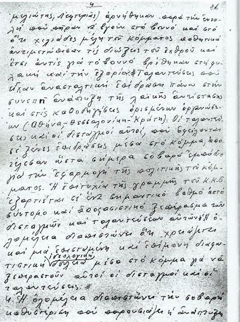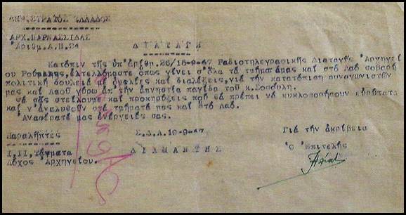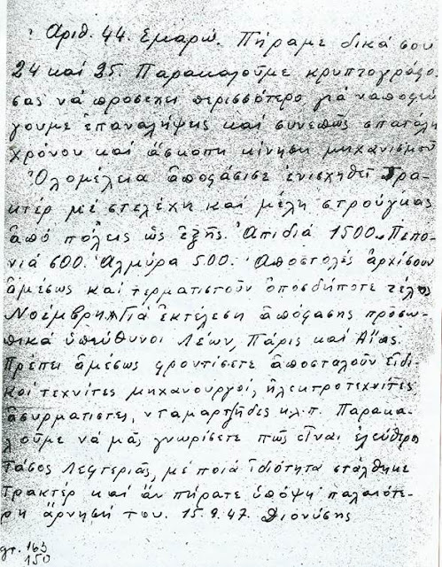 Πρέπει αμέσως φροντίσετε αποσταλούν ειδικοί τεχνίτες μηχανουργοί, ηλεκτροτεχνίτες, ασυρματιστές, νταμαρτζήδες κ.λπ. Παρακαλούμε να μας γνωρίσετε πώς είναι ελεύθερος Τάσος Λεφτεριάς, με ποια ιδιότητα στάλθηκε τρακτέρ και αν πήρατε υπόψη παλαιότερη άρνησή του. 15.9.47. Διονύσης