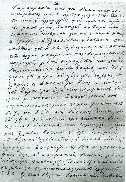 β) αποδέχεται βασικά την έκθεση της στρατιωτικοπολιτικής ηγεσίας του ΔΣΕ σα βάση για την πραγματοποίηση από στρατιωτική πλευρά της πολιτικής του ΚΚΕ, για τη δημιουργία της λέφτερης περιοχής στη Βόρεια Ελλάδα, γ) αναθέτει στο δεύτερο κλιμάκιο του ΠΓ όπως επί τόπου στη λέφτερη περιοχή διευθύνη και οργανώσει όλη την κομματική πολιτικοστρατιωτική δουλειά για την πραγματοποίηση της απόφασης αυτής και ιδιαίτερα του σχεδίου της ηγεσίας του ΔΣΕ.