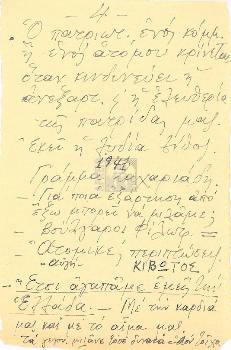 Η οικογ. όλη εξοντώνεται. Και τώρα η ίδια τύχη περιμένει και μένα. Η περίπ. μου δεν είναι μοναδική. Είναι πολλές, πάρα πολλές. Αυτός ο μονόπλευρος εμφύλιος πόλεμος κατά των οπαδών της αριστ. θα φέρει νέες μεγάλες συμφ. στην Ελλ. Ενώ αν υπήρχε καλή θέληση από την πλευρά της δεξιάς το πρόβλημα της σωτηρίας της άτυχης χώρας μας και του λαού της θα ήταν αρκετά απλό γιατί κρίνεται στις λέξεις: Γενική αμνηστία, Δημοκρατία, Ειρήνη και μέτρα για τη βελτίωση του βιωτικού επιπέδου του λαού. Αλλά ποια κυβέρνηση θα εφαρμόσει ένα τέτοιο πρόγραμμα; Ιδού το ερώτημα όπως λέει και ο μεγάλος Αγγλος ποιητής. That is the question».