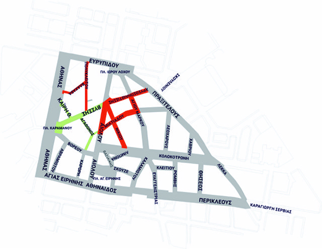 Ο δήμος Αθηναίων, στο πλαίσιο της αποκατάστασης του Εμπορικού Τριγώνου της Αθήνας και της ανάδειξής του σε τρίγωνο – πρότυπο, ολοκληρώνει την πρώτο φάση πεζοδρομήσεων, αποδίδοντας από την ερχόμενη Πέμπτη στους πεζούς τέσσερις ακόμη δρόμους: τις οδούς Χρυσοσπηλιωτίσσης, Νικίου, Πολυκλείτου και Βλαχάβα (σκιασμένοι με κόκκινο χρώμα στον χάρτη).