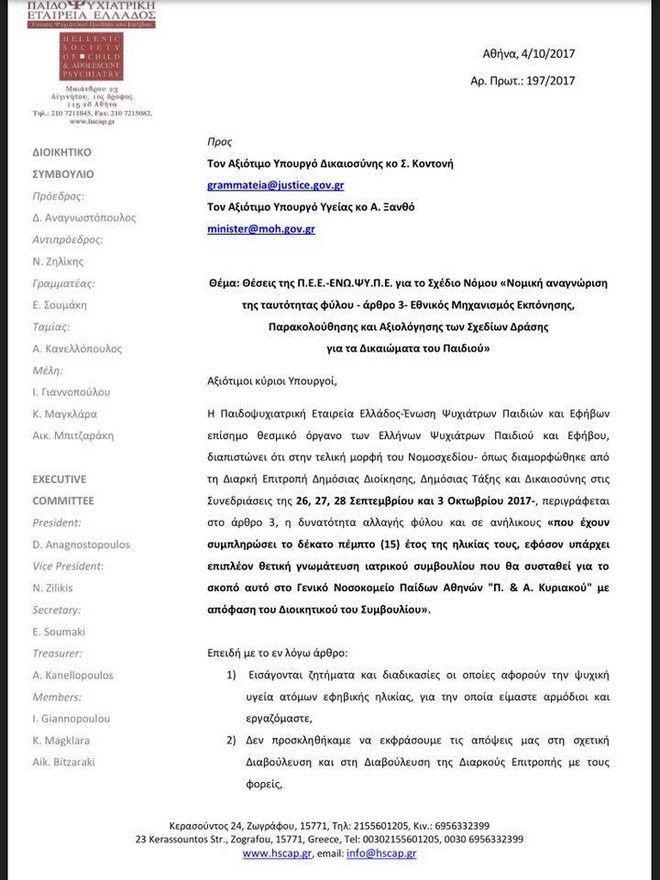 "Θεωρούμε καθήκον μας να εκφράσουμε την αντίθεση μας για την επέκταση δυνατότητας αλλαγής φύλλου σε άτομα αυτής της ηλικίας (15 μέχρι την ενηλικίωση), ηλικία η οποία χαρακτηρίζεται από ρευστότητα της διαμορφούμενης ταυτότητας φύλου καθώς και τις ανησυχίες μας ότι η εμπλοκή των εν λόγω νέων στη διαδικασία θα επιβαρύνει παρά θα βελτιώσει την ψυχική τους κατάσταση" σημειώνει μεταξύ άλλων η Παιδοψυχιατρική Εταιρεία.