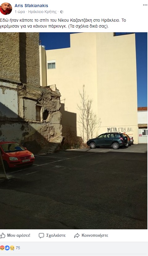 Σε… πάρκινγκ έχει μετατραπεί το σπίτι του Νίκου Καζαντζάκη στο Ηράκλειο της Κρήτης, όπως καταγγέλλει με ανάρτησή του σε μέσο κοινωνικής δικτύωσης ο γνωστός συγγραφέας, Άρης Σφακιανάκης.