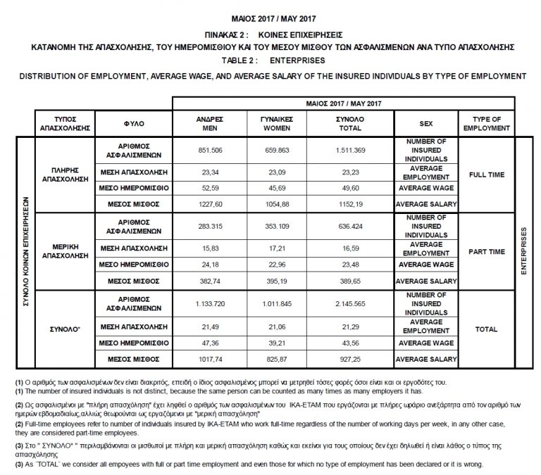 Στο σύνολο των ασφαλισμένων, η μέση απασχόληση είναι 21,21 ημέρες, στους ασφαλισμένους στις κοινές επιχειρήσεις 21,29 και στους ασφαλισμένους στα οικοδομοτεχνικά έργα 14,26. Στο σύνολο των κοινών επιχειρήσεων, σε ασφαλισμένους με πλήρη απασχόληση, το μέσο ημερομίσθιο ανήλθε στα 49,60 ευρώ και ο μέσος μισθός στα 1.152,19 ευρώ. Αντίστοιχα, στη μερική απασχόληση, ανήλθαν στα 23,48 ευρώ και 389,65 ευρώ. Στα οικοδομοτεχνικά έργα, το μέσο ημερομίσθιο διαμορφώθηκε στα 42,07 ευρώ και ο μέσος μισθός στα 599,92 ευρώ.
