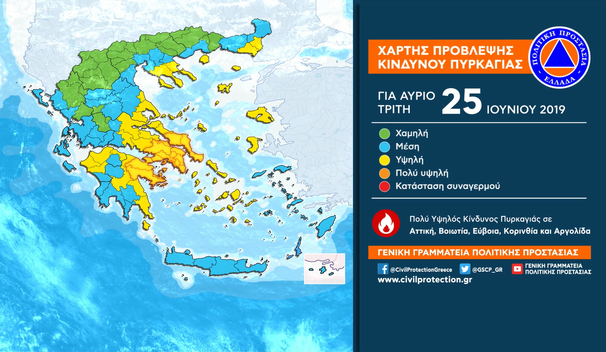 Σύμφωνα με τον Ημερήσιο Χάρτη Πρόβλεψης Κινδύνου Πυρκαγιάς της Γενικής Γραμματείας Πολιτικής Προστασίας, στο "πορτοκαλί" βρίσκονται Αττική, Βοιωτία κεντρική και νότια Εύβοια, Αργολίδα και Κορινθία.
