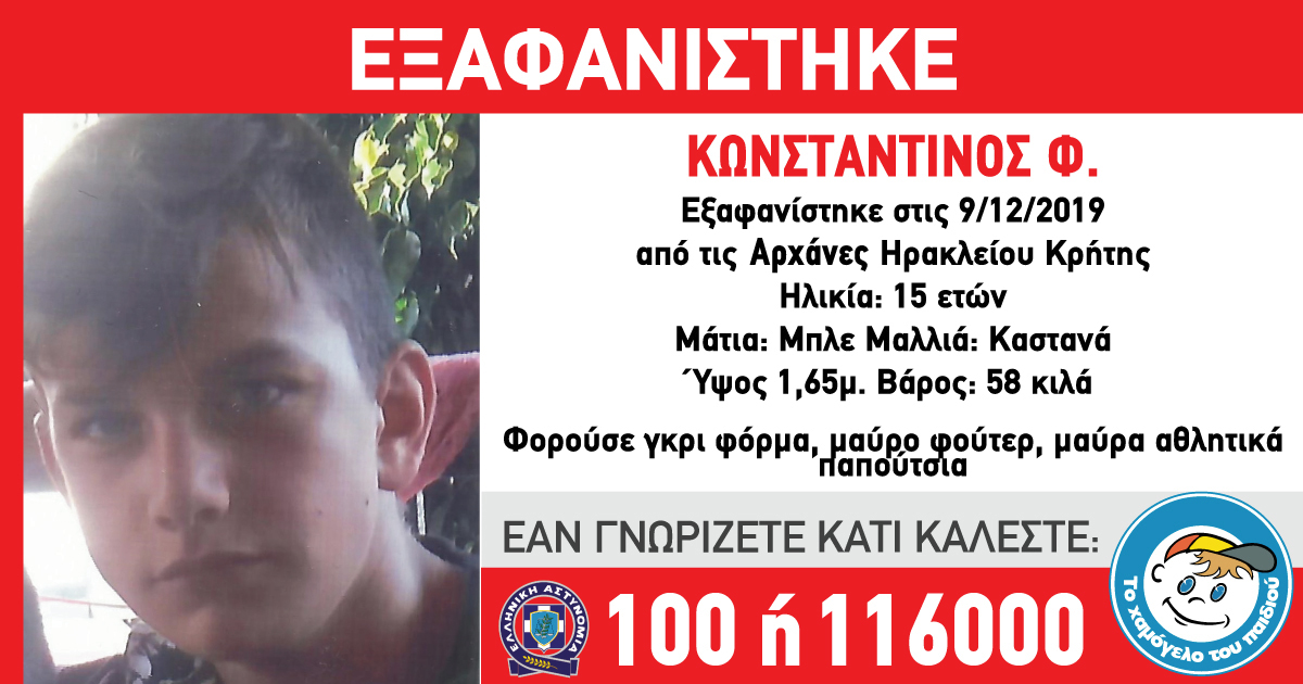 Σύμφωνα με «Το Χαμόγελο του Παιδιού», στις 09/12/2019 και ώρα 18:00, εξαφανίστηκε από την περιοχή Αρχάνες στο Ηράκλειο Κρήτης, ο Κωνσταντίνος Φ., 15 ετών.
