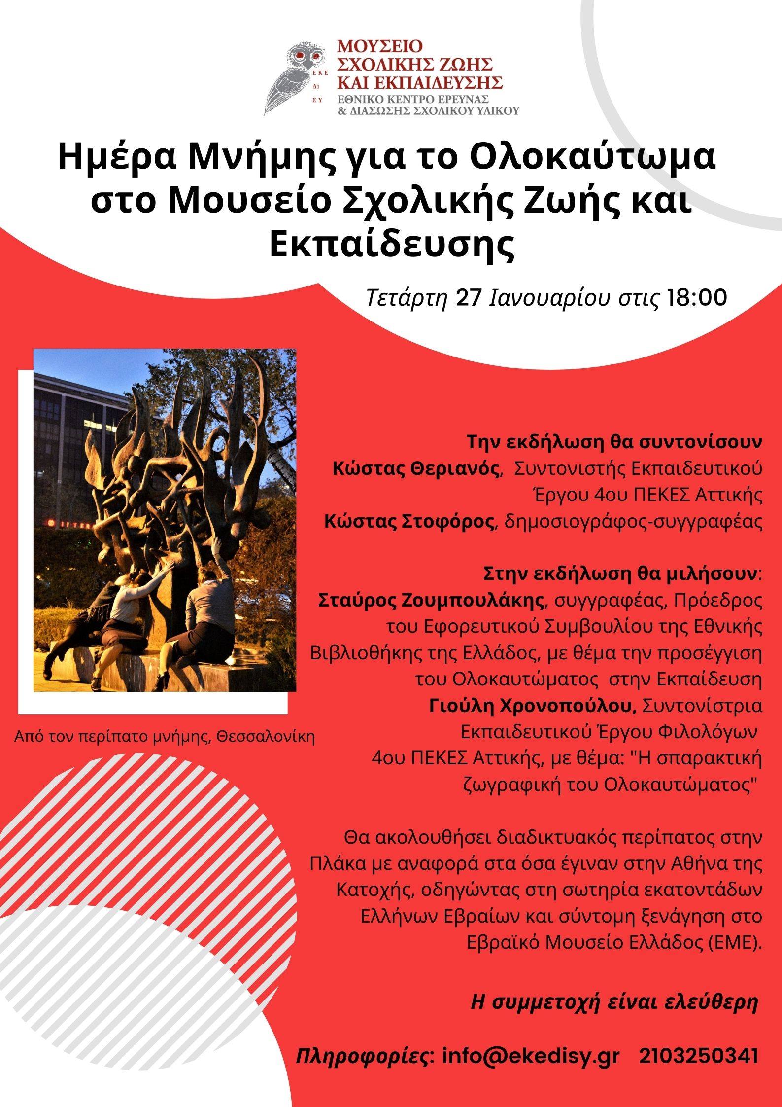 Διαδικτυακή εκδήλωση που απευθύνεται σε εκπαιδευτικούς, γονείς αλλά και σε όλη την οικογένεια, διοργανώνει το Μουσείο Σχολικής Ζωής και Εκπαίδευσης, θέλοντας να συμβάλλει στην Ημέρα Μνήμης του Ολοκαυτώματος.