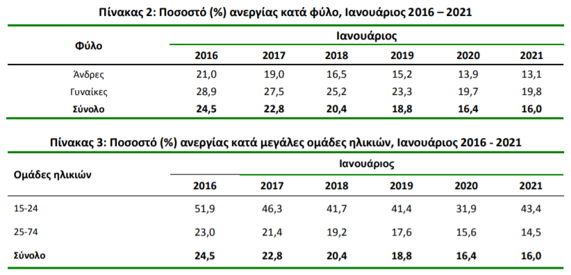 - Το εποχικά διορθωμένο ποσοστό ανεργίας τον Ιανουάριο του 2021 ανήλθε σε 16,0% έναντι του διορθωμένου προς τα κάτω 16,4% τον Ιανουάριο του 2020 και του διορθωμένου προς τα κάτω 15,6% τον Δεκέμβριο του 2020.