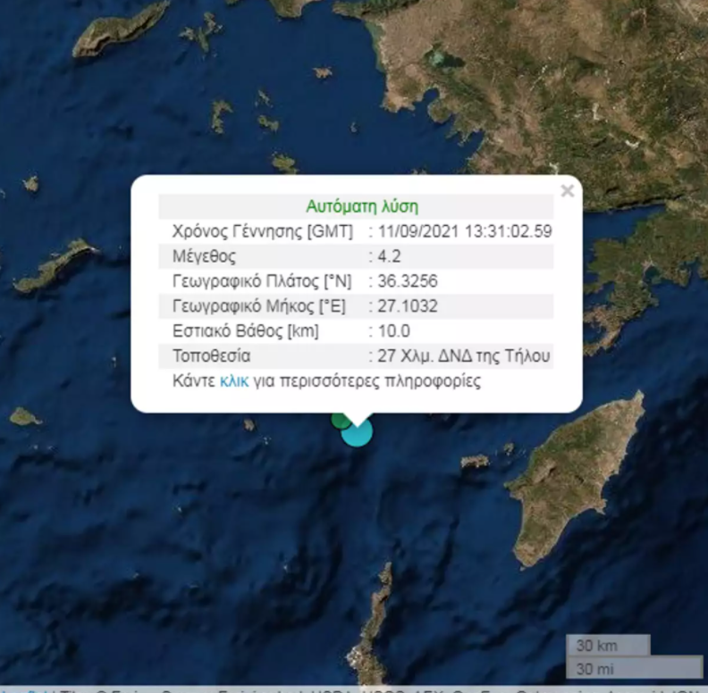 Σεισμός 4,2 βαθμών της κλίμακας Ρίχτερ σημειώθηκε στην Τήλο.