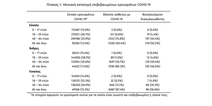 Οι νέοι θάνατοι ασθενών με COVID-19 είναι 59, ενώ από την έναρξη της επιδημίας έχουν καταγραφεί συνολικά 16.050 θάνατοι. Το 95.4% είχε υποκείμενο νόσημα ή/και ηλικία 70 ετών και άνω.
