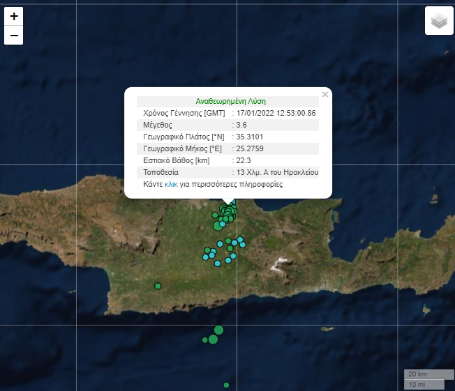 Ο πρώτος σεισμός είχε ένταση 3,8 Ρίχτερ και το επίκεντρο ήταν 13 χιλιόμετρα ανατολικά του Ηρακλείου. Το εστιακό βάθος εντοπίζεται στα 24,6 χιλιόμετρα.