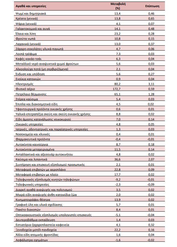 Αντίστοιχα, αύξηση της τάξεως του 65,1% κατέγραψε το πετρέλαιο θέρμανσης, 80% τα τιμολόγια ρεύματος και 36,6% τα καύσιμα και τα λιπαντικά.