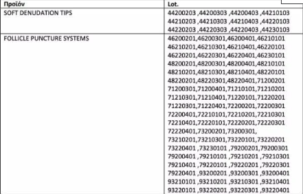 Την ανάκληση των παρτίδων του παραπάνω πίνακα των ιατροτεχνολογικών προϊόντων Κατηγορίας MDD Class IIa, SOFT DENUDATION TIPS + FOLLICLE PUNCTURE SYSTEMS λόγω του ότι κατά την διάρκεια της αξιολόγησης του κινδύνου, η ασφάλεια των προϊόντων δεν μπορεί να επιβεβαιωθεί αποδεδειγμένα, ιδίως όσον αφορά την εμβρυοτοξικότητα.